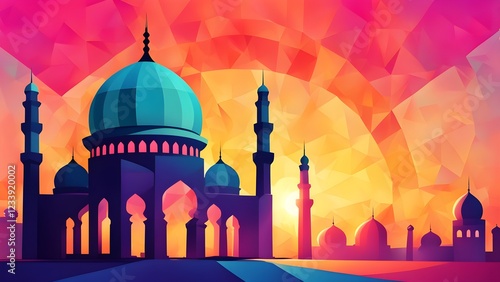 Vibrant low-poly illustration of a majestic mosque at sunset, featuring teal and purple hues.