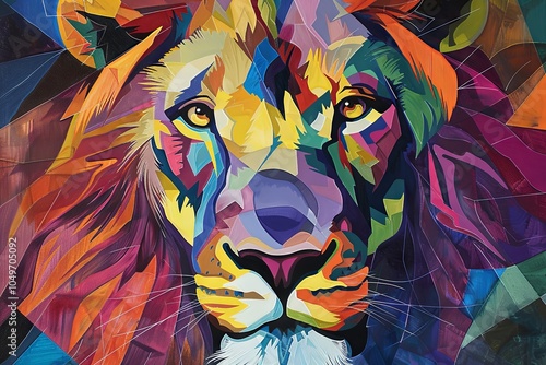 Vibrant Low-Poly Lion Portrait: A Colorful, Abstract Representation of Majesty and Strength in Art, Perfect for Wildlife and Nature Themes.