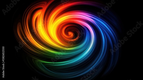 Vibrant luminous swirl of spectral colors on black radiating energy and flow