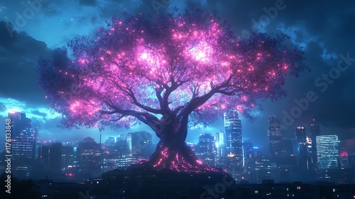 Vibrant luminous tree spreading glowing branches across futuristic city designs