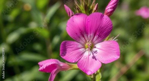 Vibrant magenta wildflower with delicate water droplets, set against a soft, blurred green backdrop of foliage and further blooms.