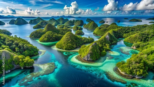 Vibrant mangrove forests stretch towards the horizon, resembling giant mushrooms, above the turquoise waters of Raja Ampat, Papua, Indonesia, in a stunning aerial landscape.