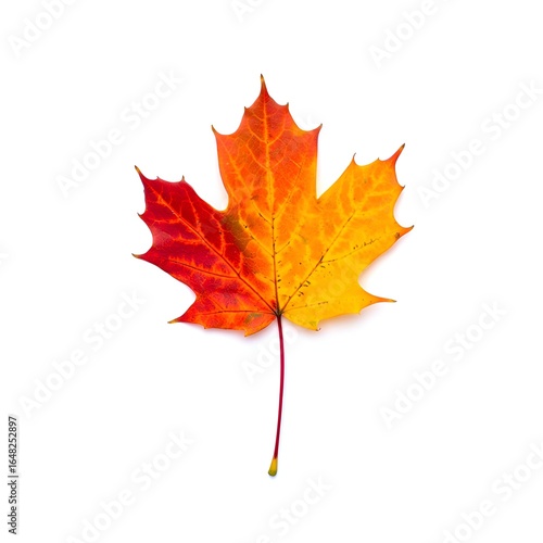 Vibrant maple leaf transitions from red to orange and yellow against a stark white background