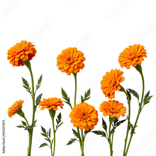 Vibrant marigold flowers in full bloom showcasing bright orange petals and lush green leaves against a white background