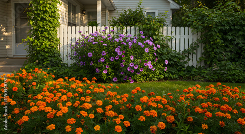 Vibrant Marigolds And Asters Blooming In A Quaint Suburban Garden