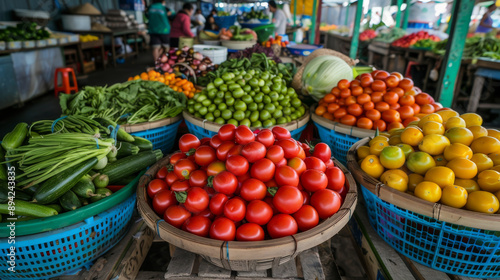 Vibrant market stall with assorted fresh vegetables and fruits in baskets, showcasing colorful produce at a local farmer's market.