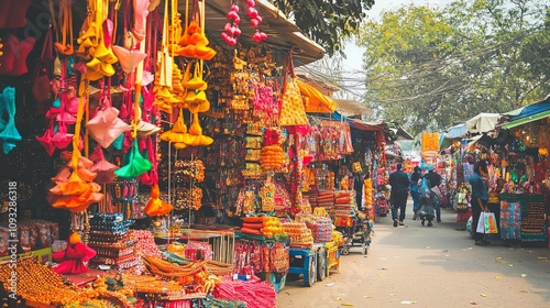 Vibrant marketplace with colorful textiles, crafts, and decorations.