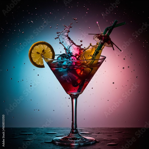 Vibrant Martini Cocktail Splash with Lemon and Umbrella.