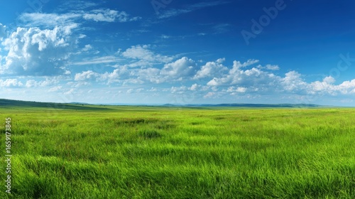 Vibrant Meadow Under a Expansive Blue Sky: A breathtaking landscape painting capturing the vast expanse of a sun-drenched grassy meadow, caressed by a gentle breeze.