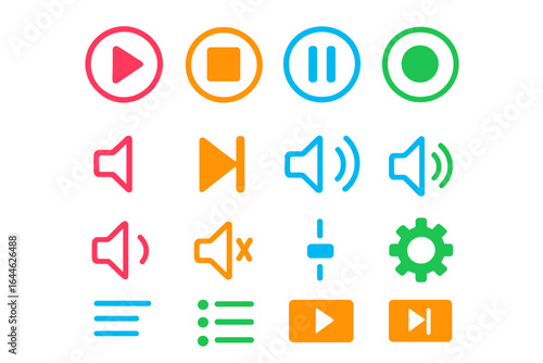 Vibrant Media Control Icon Set for Audio and Video Interfaces, Colorful Playback, Volume, Pause, Stop, Record, Settings, and Playlist Vector Illustrations on Transparent Background