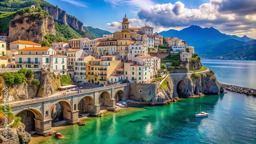Vibrant Mediterranean colors illuminate this serene seaside escape, featuring Atrani's picturesque whitewashed houses, steep streets, and turquoise waters against a dramatic Amalfi Coast backdrop.