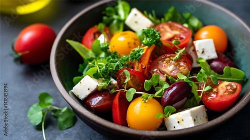Vibrant Mediterranean Wellness Bowl Artisan Nutrient-Dense Salad with Organic Heirloom Tomatoes, Fresh Herbs and Locally-Sourced Feta - Clean Eating Lifestyle Content