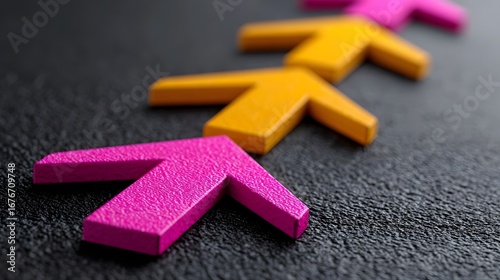 Vibrant, minimalist arrangement of stylized, three-dimensional geometric shapes in contrasting pink and yellow hues against a dark, textured surface