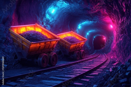 Vibrant mining carts in a colorful underground tunnel during nighttime exploration