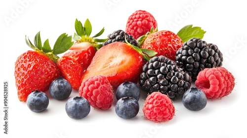 Vibrant mix of ripe strawberries, blackberries, raspberries, and blueberries, cut out on a white background