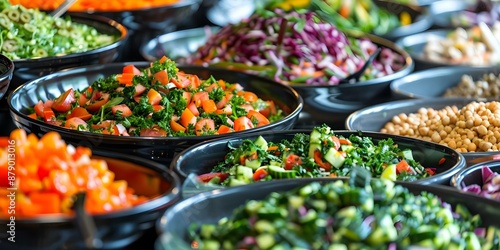 Vibrant mix of salads veggies and protein creating a visual feast. Concept Colorful Salads, Nutritious Veggies, Protein-packed Meals, Culinary Delights