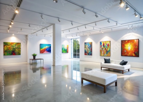Vibrant modern artworks adorn sleek white walls in a minimalist gallery, bathed in natural light pouring through expansive windows, creating a serene exhibition atmosphere.