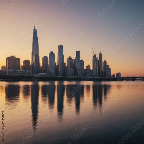 Vibrant Modern City Skyline at Sunset with Skyscrapers and River Reflection