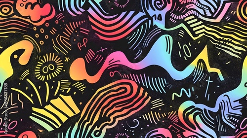 Vibrant Monochrome Doodles with Whimsical Rainbow Gradient Backdrop Spontaneous Scribbles and Quirky Anthropomorphic Objects