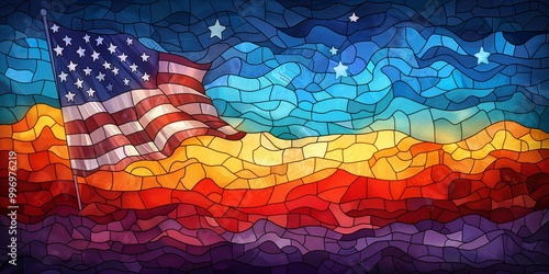 Vibrant mosaic art depicting the American flag against a sunset background, symbolizing national pride, patriotism, and the colorful spirit of the United States., Generative AI