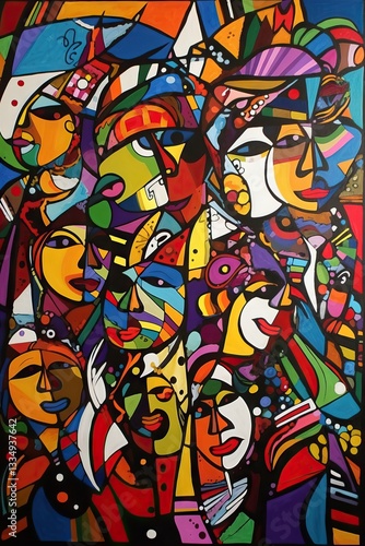 Vibrant mosaic of human forms and geometric shapes in a captivating composition of abstraction, with bold colors and cubist influences, it is a visual feast.