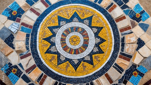 Vibrant Mosaic Pattern from Above Showcasing Artistic Design and Colorful Tiles in a Beach Setting