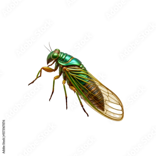Vibrant Mountain Cicada on Pine Branch with White Background