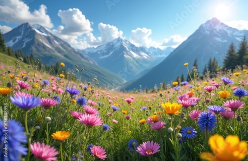 Vibrant mountain meadow bursting with colorful wildflowers like daisies, cosmos. Green grass under bright blue sky with fluffy clouds, sunlit peaks. Peaceful natural landscape in spring summer.