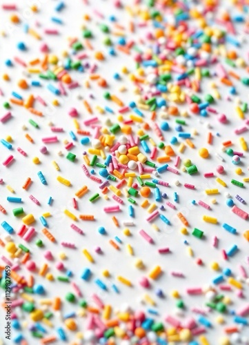 Vibrant multicolored candy sprinkles scattered on a white background , party supplies, sweet toppings