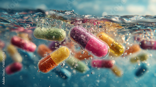 Vibrant multicolored capsules suspended in clear water surrounded by bubbles, creating a surreal and dynamic pharmaceutical scene.