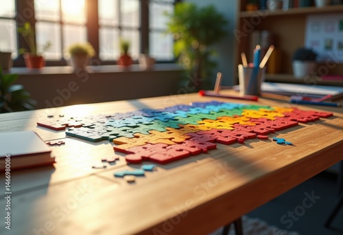 vibrant multicolored puzzle pieces assembled modern desk representing creativity collaboration problem solving, art, design, game, pattern, group, play