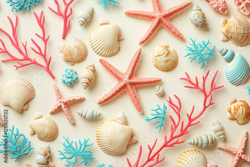 Vibrant nautical design featuring starfish, coral, and seashells in bright ocean colors on a cream background