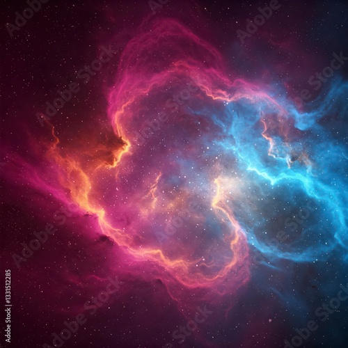 Vibrant nebula with red and blue hues, swirling gases, and bright star points against a dark, deep space backdrop
