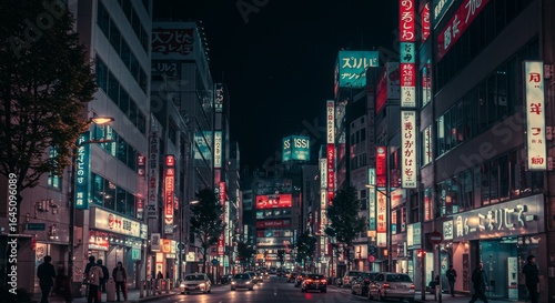 Vibrant Neon Cityscape at Night with Illuminated Signs and Buildings