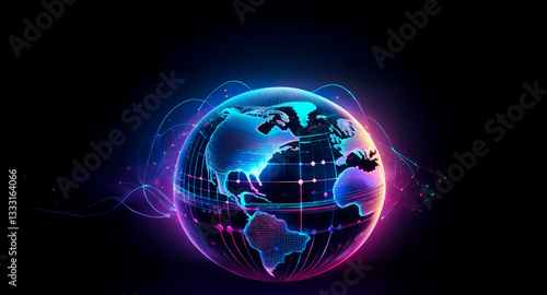 Vibrant neon globe, illuminated in blue and purple, on a dark backdrop. Lines flow outwards, suggesting global connectivity and modern technology.