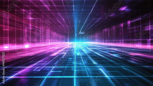 Vibrant Neon Grid with Futuristic Perspective and Abstract Lights