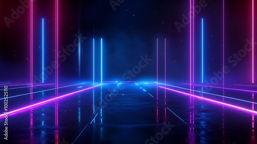 Vibrant neon lights creating a futuristic atmosphere with reflections on a dark surface.