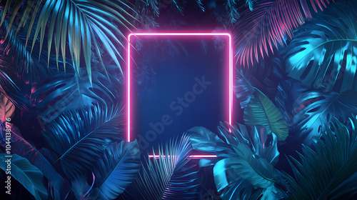 Vibrant neon lights illuminate futuristic cyber frame on fresh palm leaves with copy space against urban jungle background. Neon Cyber Jungle. Illustration