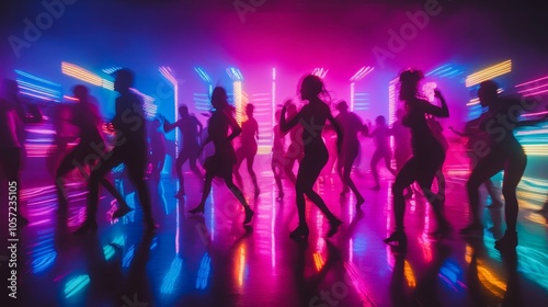 Vibrant Neon Lights Illuminating Energetic Dancing Scene with Dynamic Angles and Colorful Motion