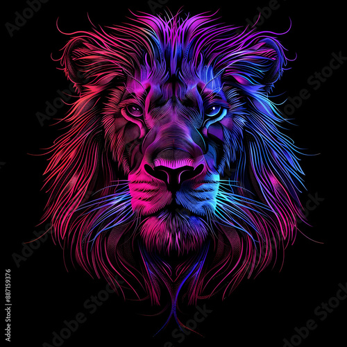 Vibrant neon lion illustration with colorful hues on a black background, showcasing a modern and artistic depiction of the majestic animal.