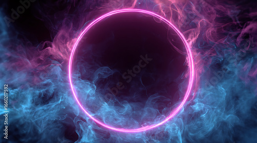 Vibrant neon oval portal surrounded by wisps of pink and blue smoke on a dark background