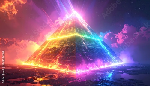 Vibrant Neon Pyramid Illuminating a Mystical Landscape at Twilight.