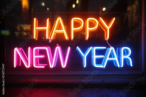 Vibrant neon sign announces Happy New Year in glowing orange, pink, and blue, perfect for festive celebrations and event promotions.