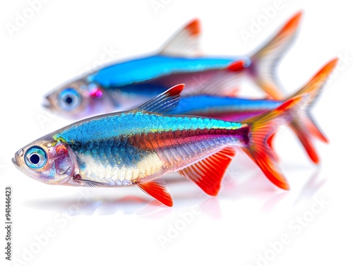 Vibrant Neon Tetras Schooling in Harmony on White Background Ornamental Fish Concept