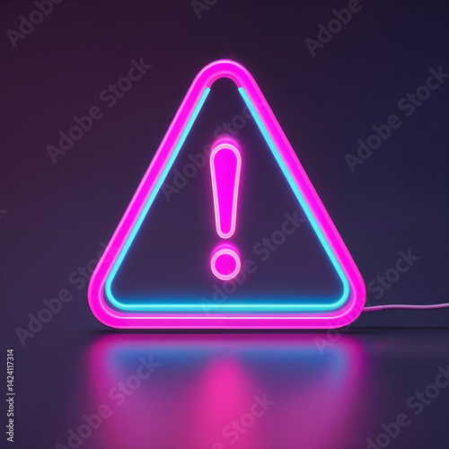 Vibrant neon warning sign with exclamation mark in glowing pink and blue triangle on dark background
