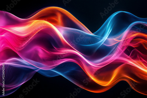 Vibrant Neon Waveforms on Dark Canvas Abstract Audio Spectrum Design for AI Equalizers and Voice Assistants in Gradient Blue Pink and Orange Stripes