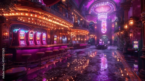 Vibrant Neon-Illuminated Casino Interior Featuring Slot Machines and Elegant Décor at Night