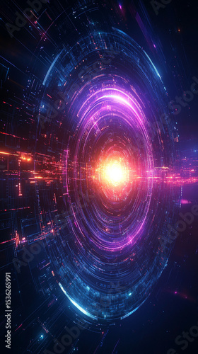 Vibrant neon-lit futuristic digital core pulsating with energy, surrounded by abstract patterns and motion effects—symbolizing innovation, power, technology, and dynamic digital energy flow.