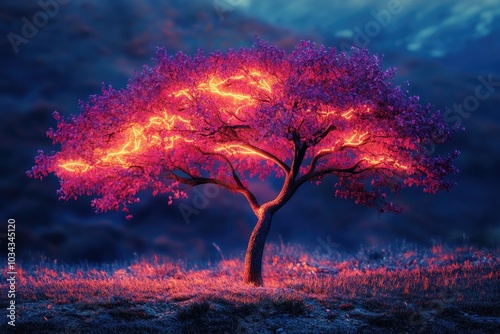 Vibrant Neon-Lit Tree in Mystical Landscape at Dusk