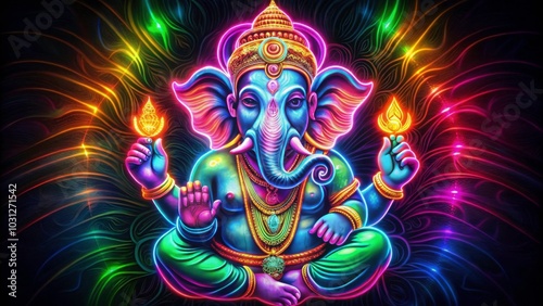 Vibrant neon-style painting of Ganesh with glowing outlines and bright colors on a dark background, Ganesh, vibrant